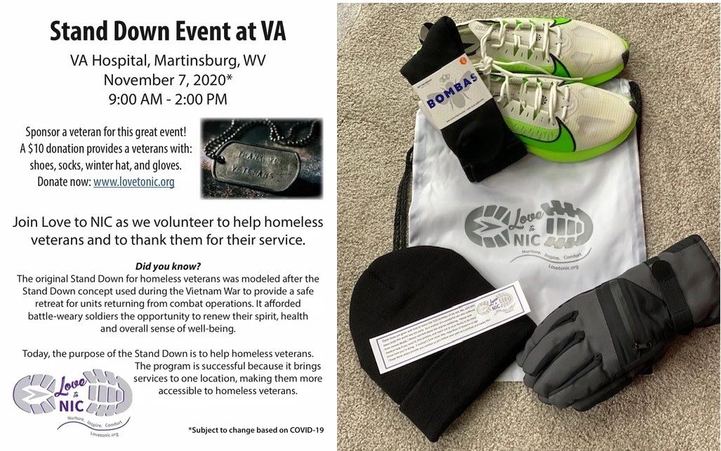 We provided shoes, socks, winter hat and gloves to the homeless Veterans. All items were put in a Love to NIC drawstring bag and the VA staff handed them out due to COVID-19.